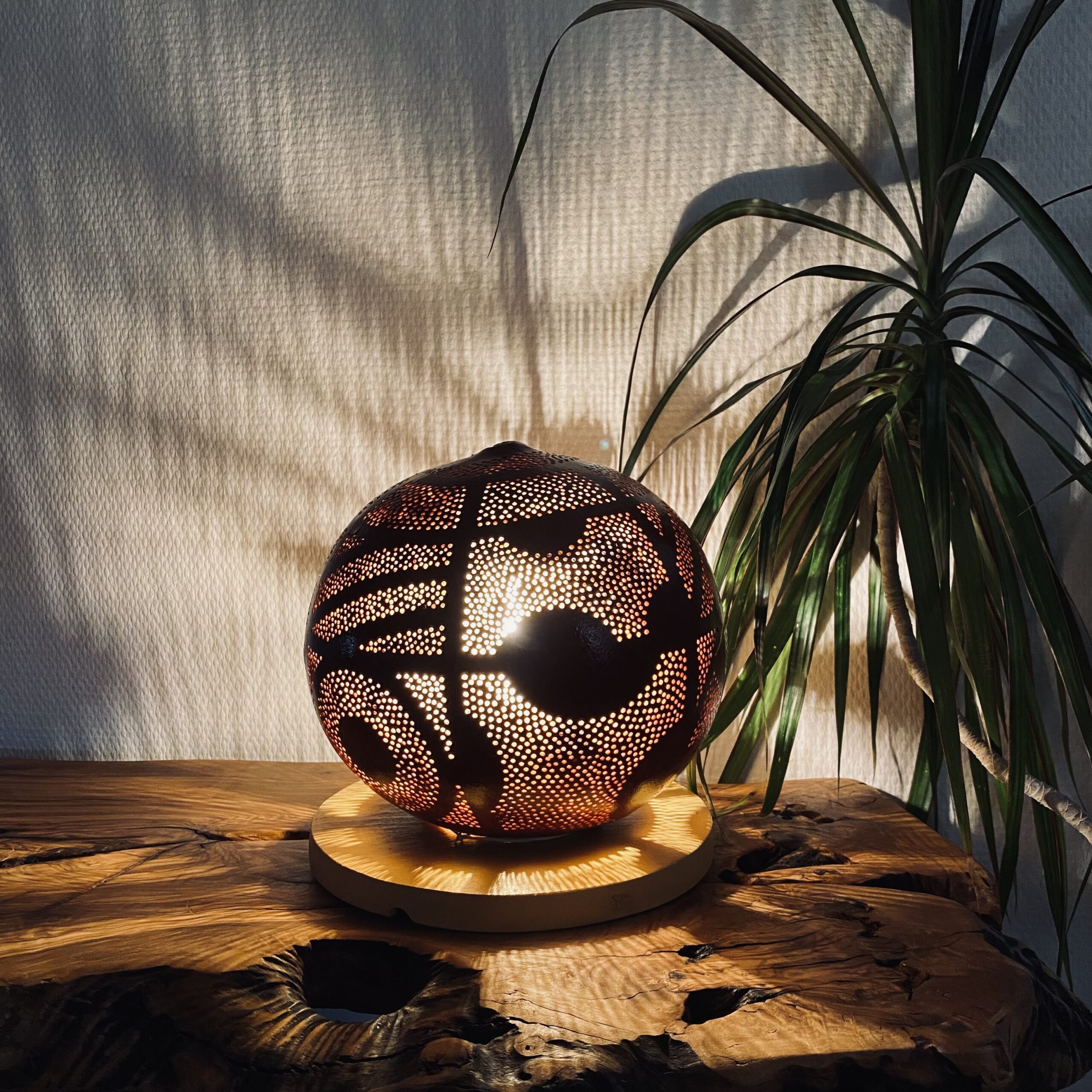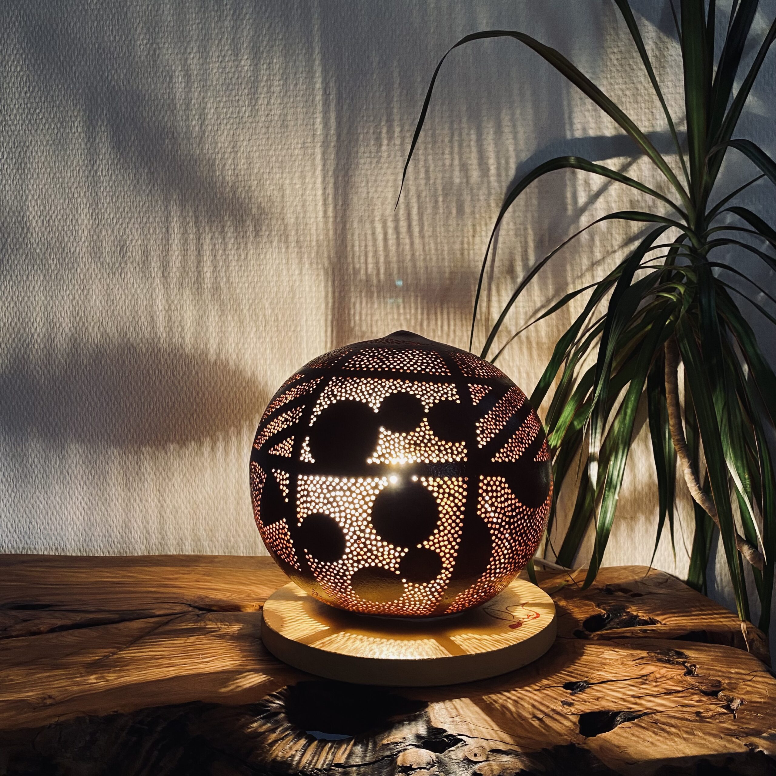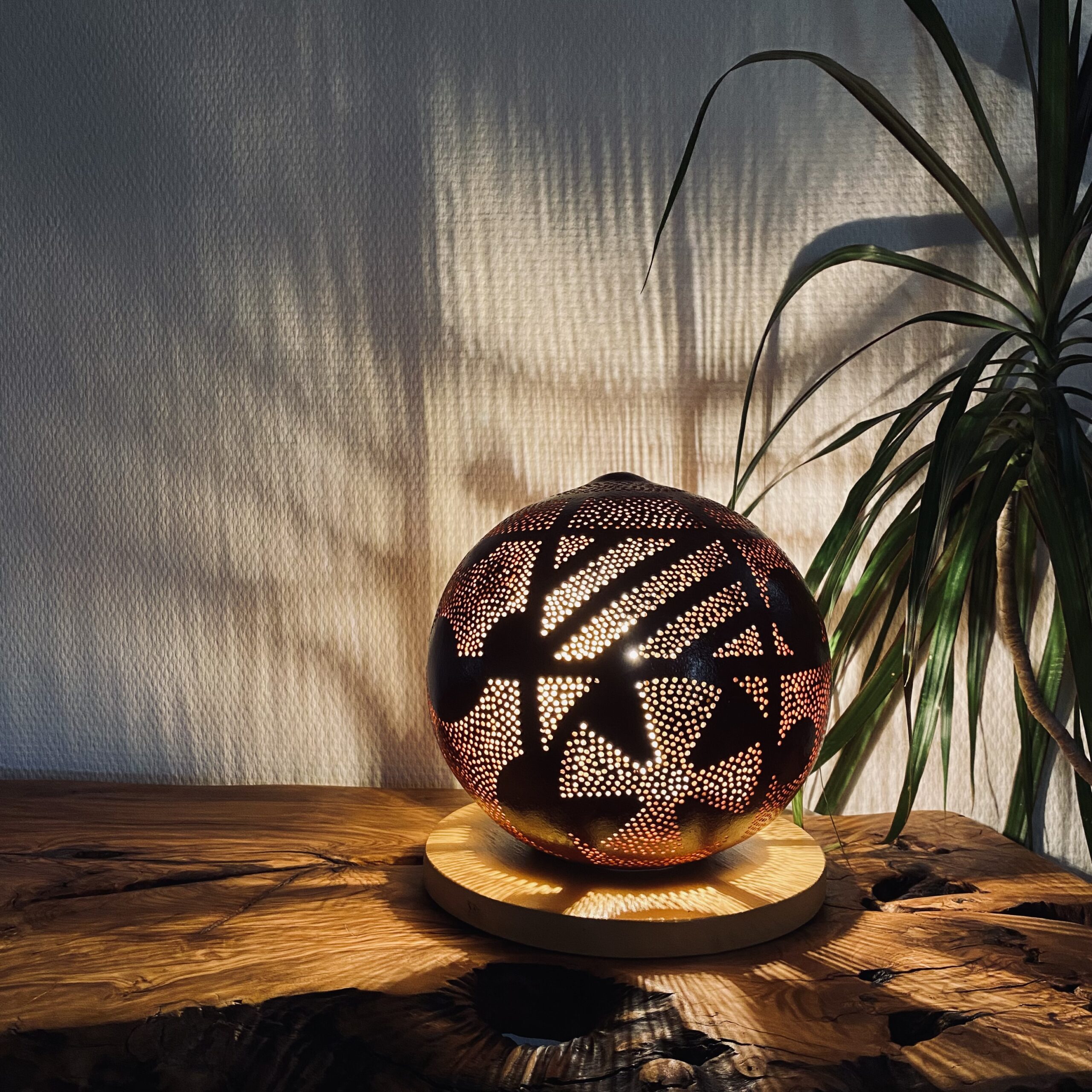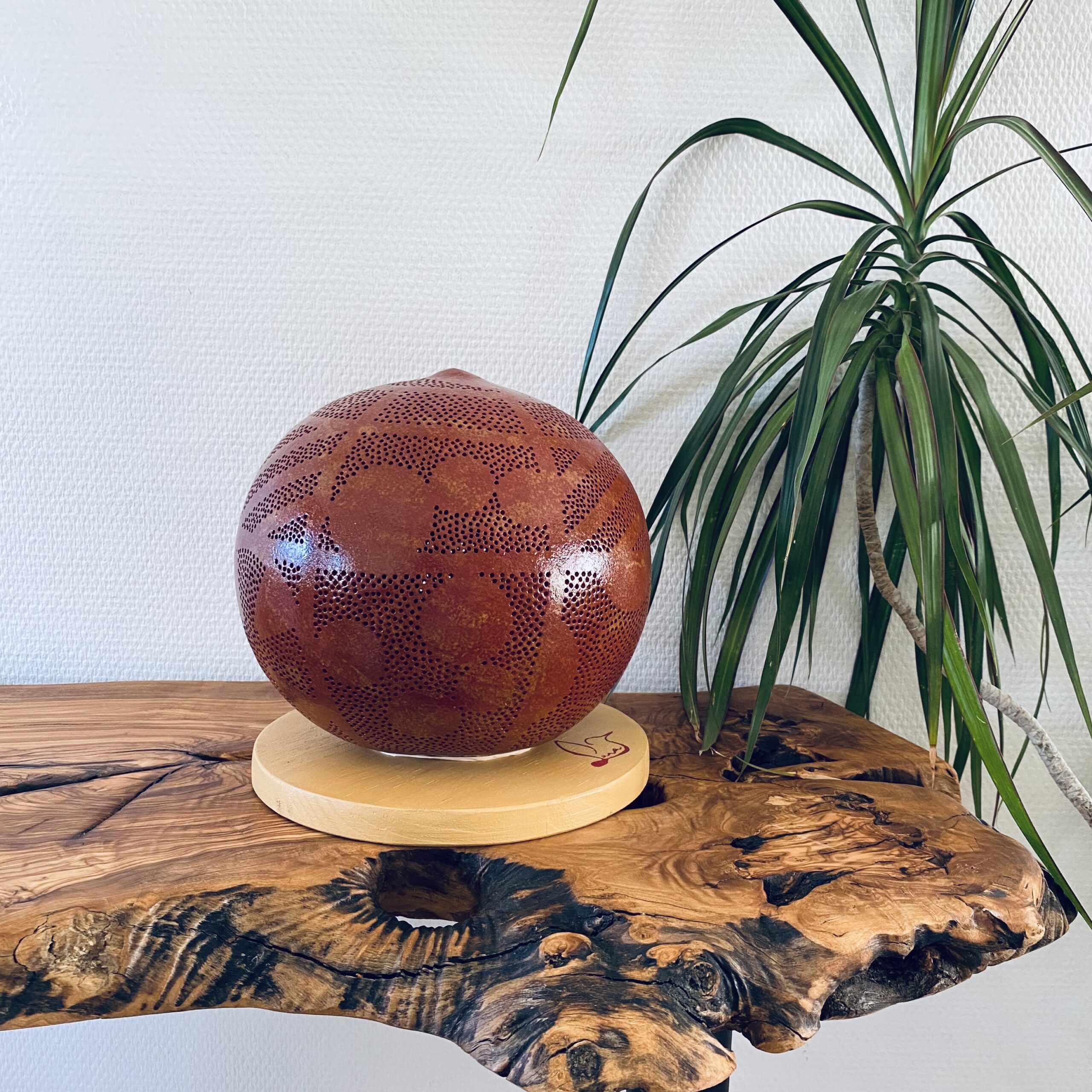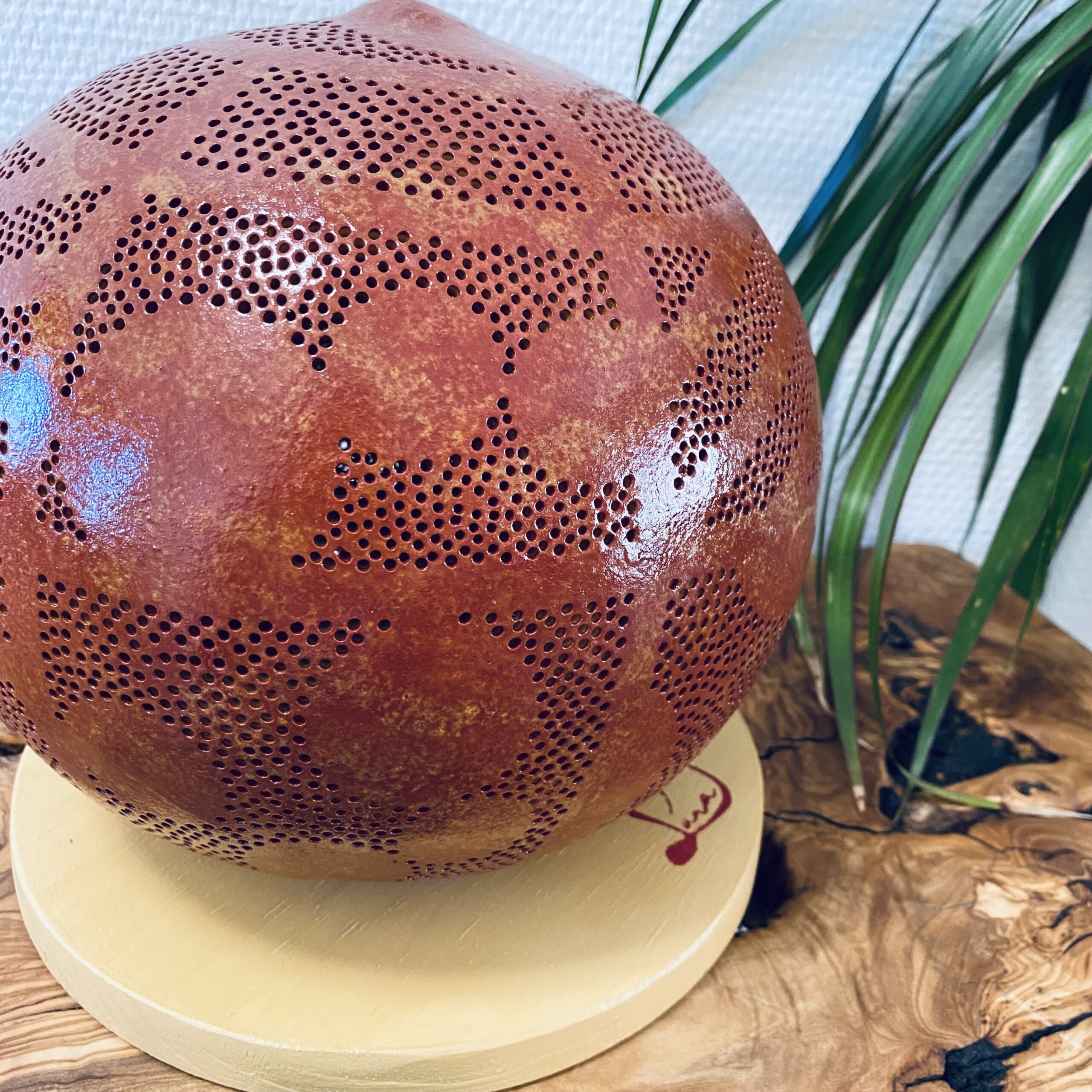 Lampe en calebasse de grande taille peinte avec des ocres rouge cassis et jaune foncé de Provence. Allumée, les motifs inspirés de l’abstraction géométrique prennent toute leur splendeur. Disposée contre un mur, les motifs se projettent.