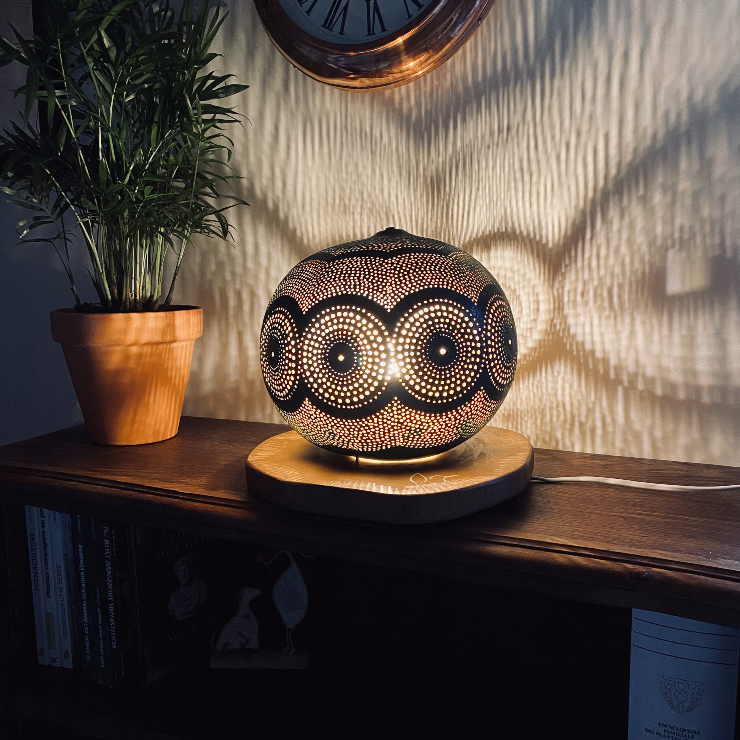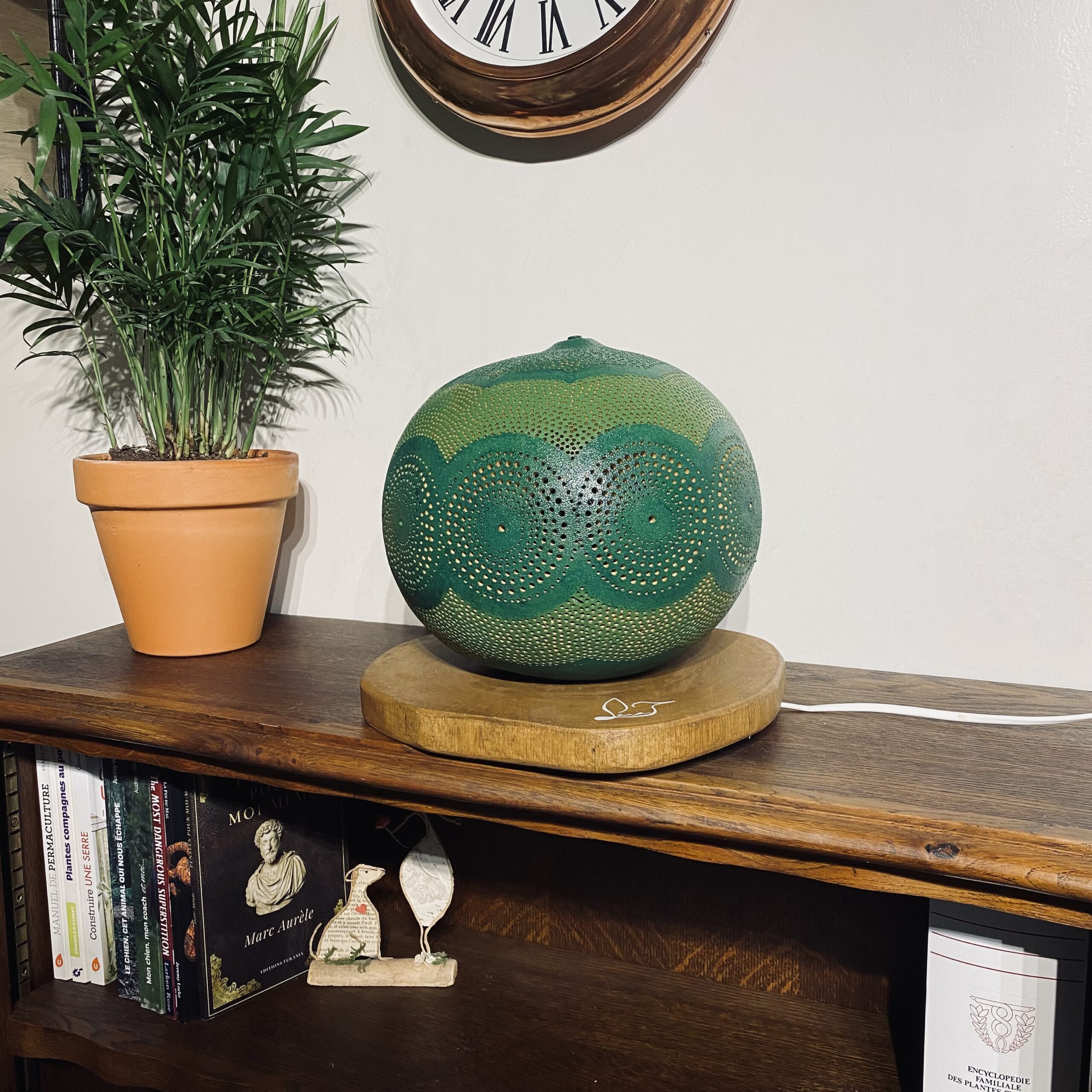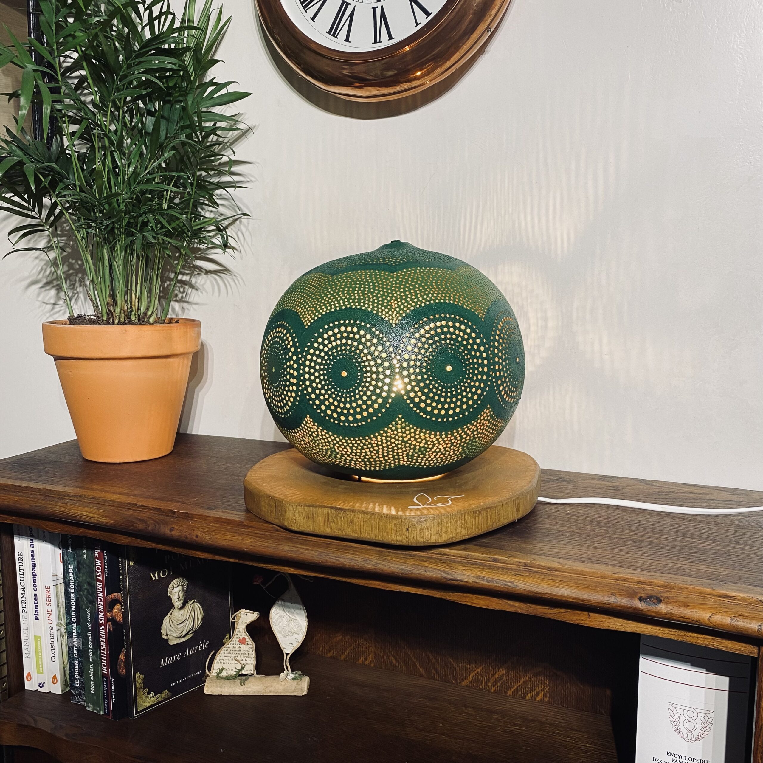 Dimensions produitLampe en calebasse de grande taille peinte avec des ocres vert clair et vert foncé. Allumée, les motifs géométriques circulaires prennent toute leur splendeur. Disposée contre un mur, les motifs se projettent.