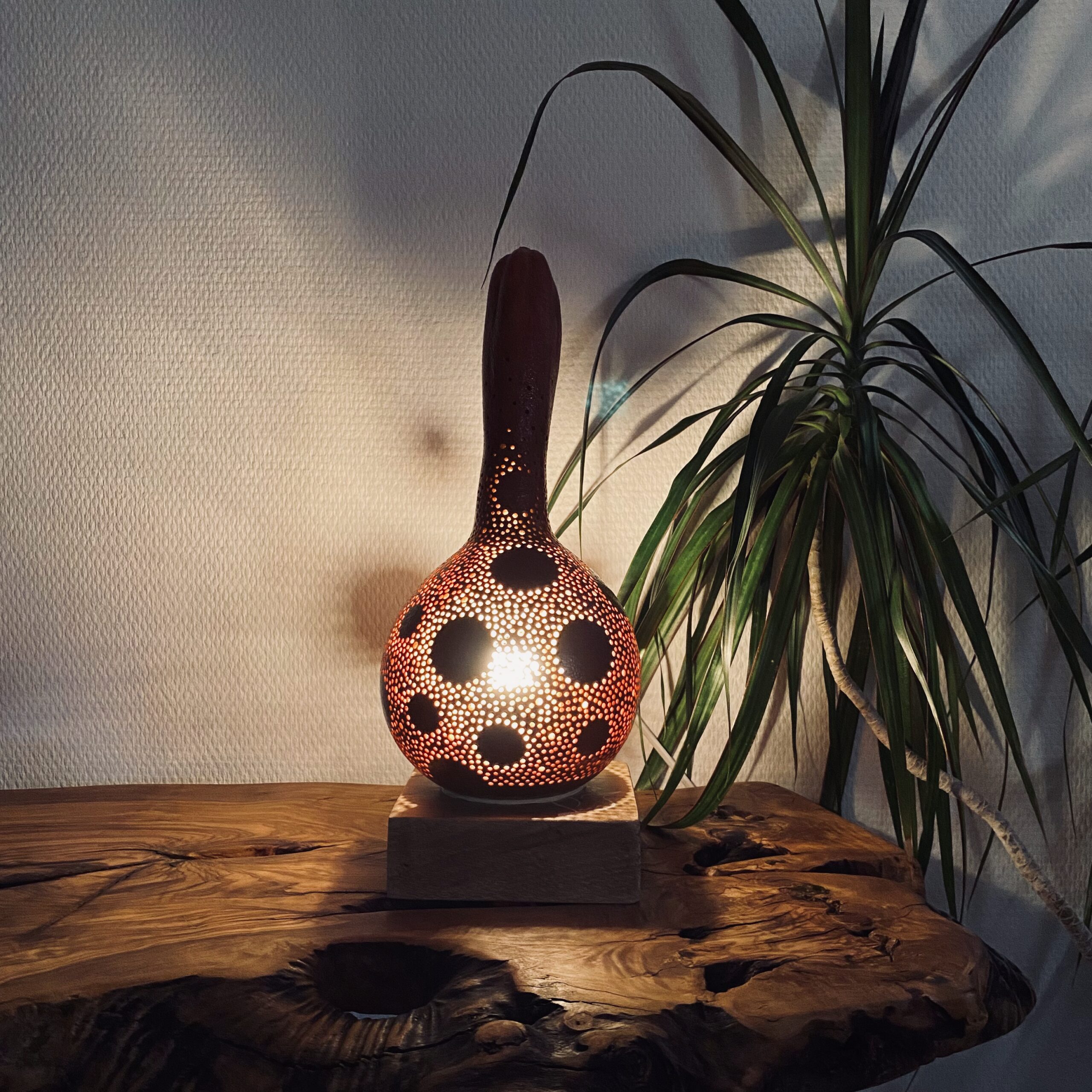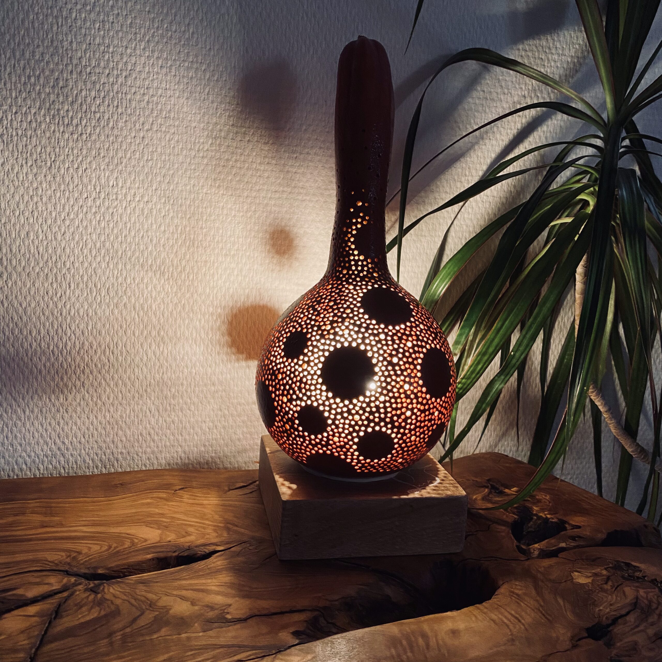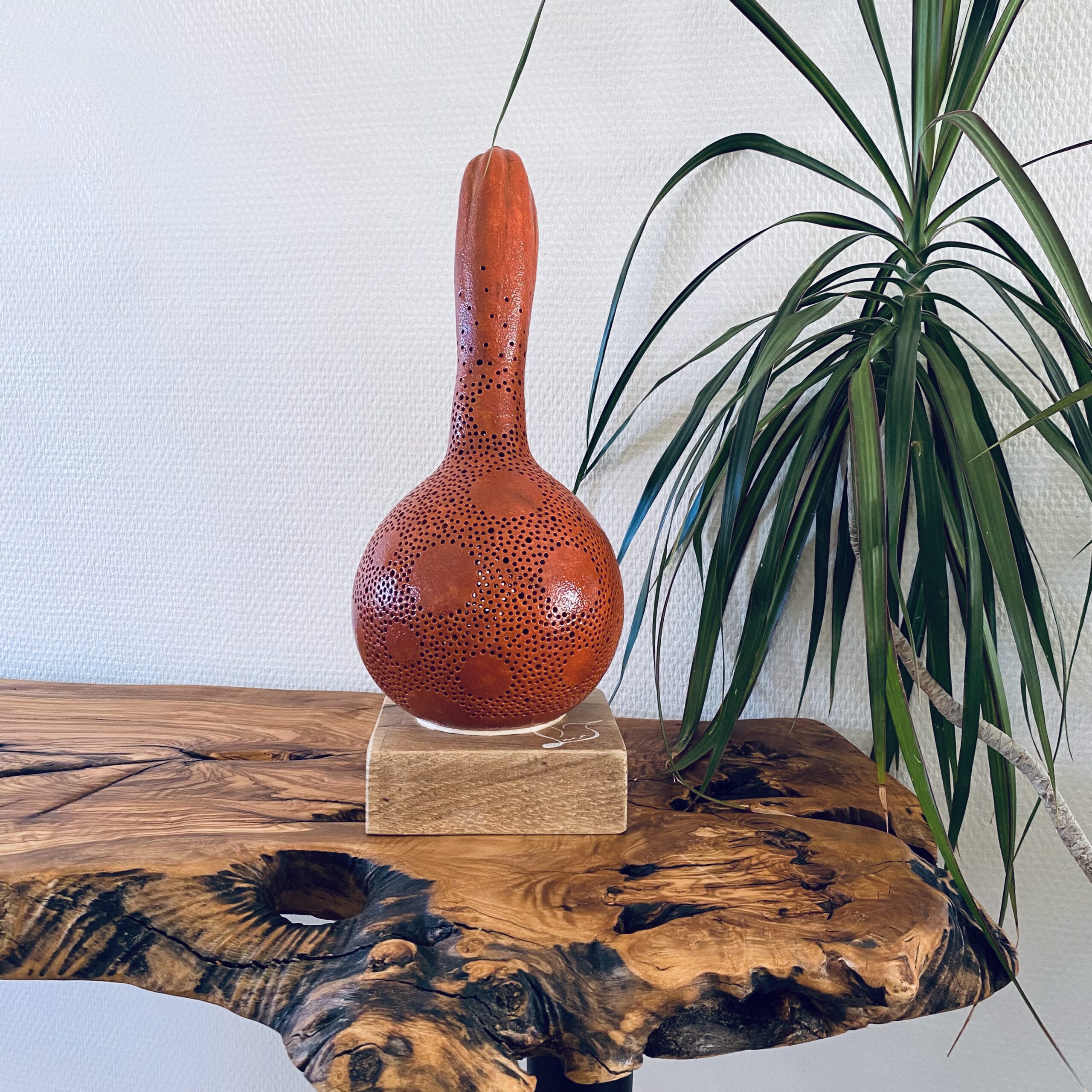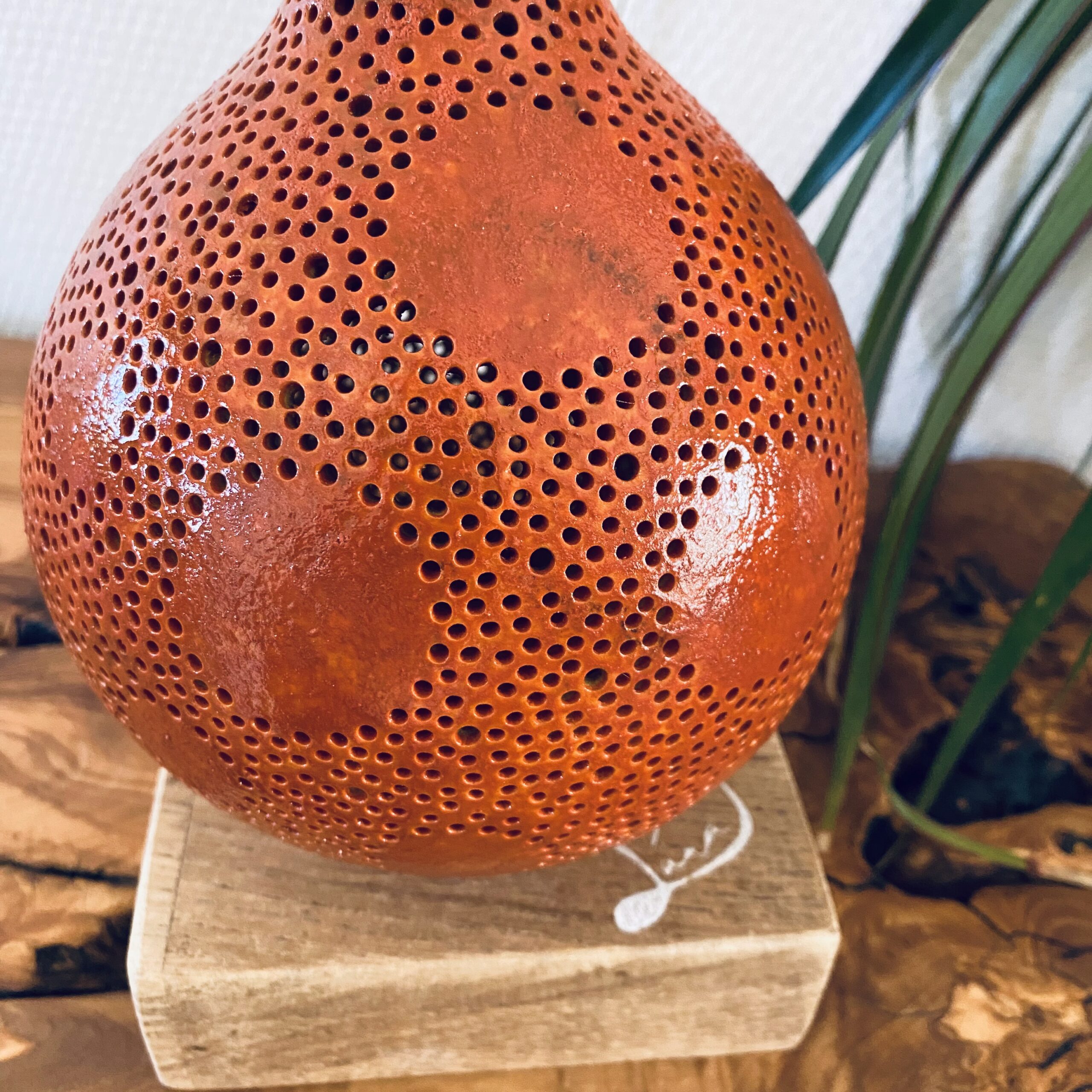 Lampe en calebasse de petite taille, motifs géométriques circulaires, peinte avec des pigments bois de rose dont la teinte tire vers le orangé/brique claire.